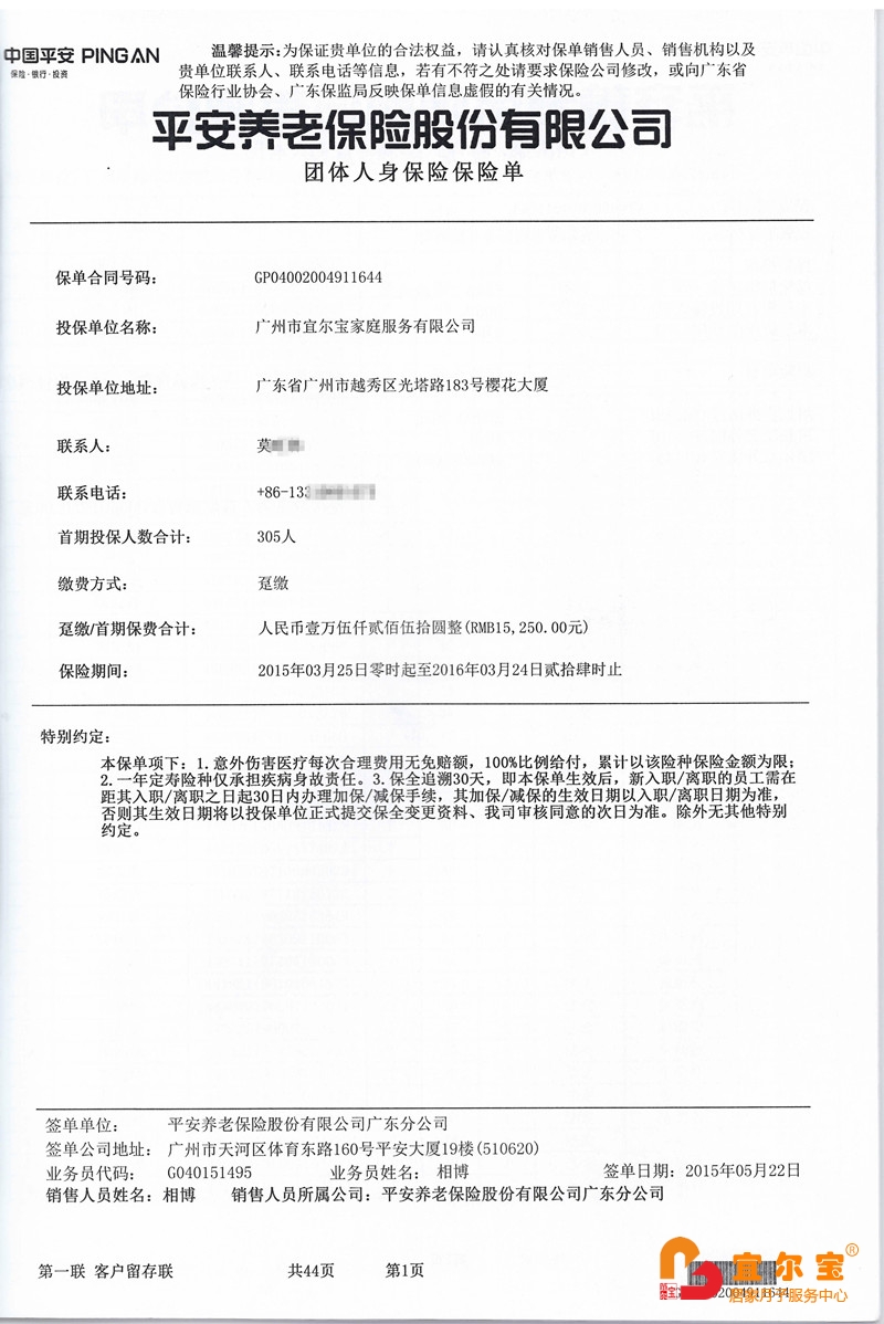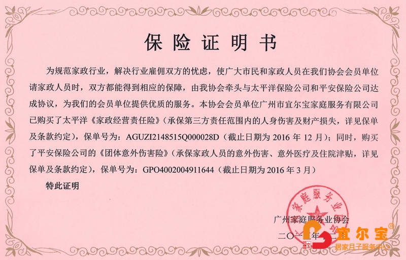 宜爾寶月嫂家政經(jīng)營責(zé)任保險(xiǎn)保單