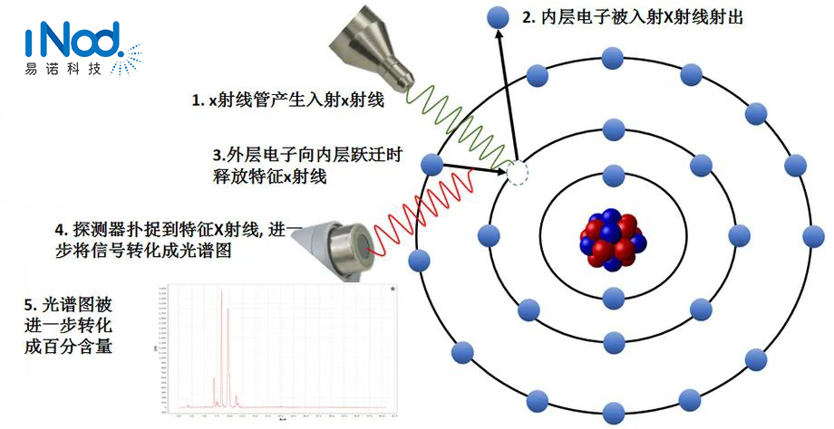 奧林巴斯手持式光譜儀的試樣中被測(cè)元素的原子受到來自于X射線管的一次X射線激發(fā)而引起內(nèi)層電子的躍遷,同時(shí)發(fā)射出具有一定能量的X 射線二次熒光,利用高性能(能量分辨率<170eV)的X 射線硅漂移SDD檢測(cè)器探測(cè)試樣中被測(cè)元素所發(fā)出的各種能量的特征X 射線,根據(jù)檢測(cè)器輸出信號(hào)的能量大小和強(qiáng)度來對(duì)被測(cè)元素進(jìn)行定性和定量分析。