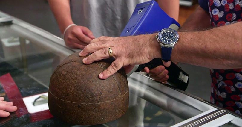 在這一期節(jié)目中,一位顧客帶來(lái)了一個(gè)被認(rèn)為是鐵做的頭盔。一位專(zhuān)家證實(shí),這是一個(gè)約有1500年歷史的真正的盎格魯-撒克遜頭盔。這頂頭盔完好無(wú)損,是一件非常罕見(jiàn)的古董。通常情況下,鐵會(huì)在有氧氣存在的環(huán)境中分解,因此這個(gè)頭盔很可能被遺留在如沼澤或河流等的缺氧環(huán)境中而得以完好保存。