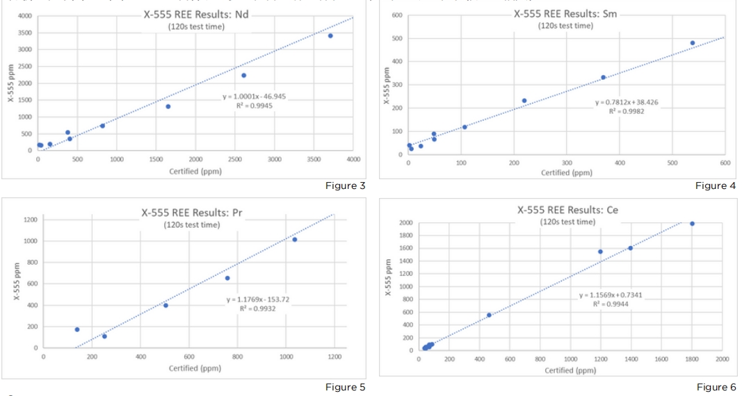 X-555具有特殊的屏蔽能力和3mm直徑的光束準直性,可直接用于巖石表面和巖芯。它還可以配備一個聯(lián)鎖試驗臺,用于袋裝或袋裝樣品的安全分析。在下圖3-6中,X-555對各種認證參考材料的研究結(jié)果顯示,它們與認證值有很好的相關(guān)性。