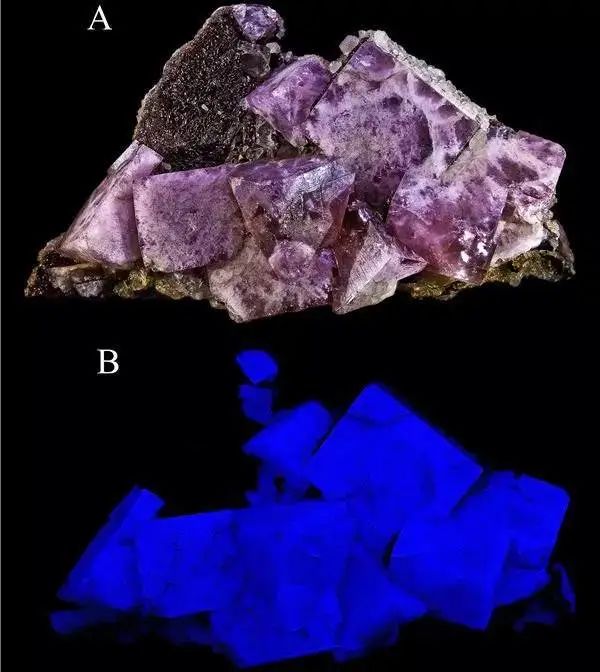 熒光,最初是在螢石身上發(fā)現(xiàn)的。某些紫色螢石在紫外線的照射下會呈現(xiàn)出藍(lán)色,完全不同于它在日光下的顏色。除此之外,一些方柱石、方解石、石膏、方鈉石、水砷鋅礦、文石等也會產(chǎn)生熒光效應(yīng),但是地質(zhì)學(xué)家總結(jié)的經(jīng)驗是,用熒光效應(yīng)來判別礦物并不十分靠譜,因為只有極少數(shù)礦物具有這種特征,即使這些礦物產(chǎn)自同一個礦區(qū),也不一定都能產(chǎn)生熒光。