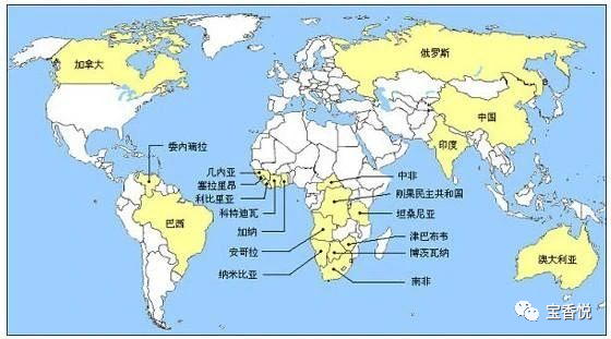 南亞和南美、非洲是彩色寶石的主要產地,特別是緬甸、巴西、斯里蘭卡、馬達加斯加、俄羅斯、加拿大等國,擁有數種寶石的頂級礦藏,占世界寶石資源分布總量的95%以上。著實令人羨慕,而資源比較貧乏的區(qū)域有歐洲、格陵蘭、北美東部和西非。
