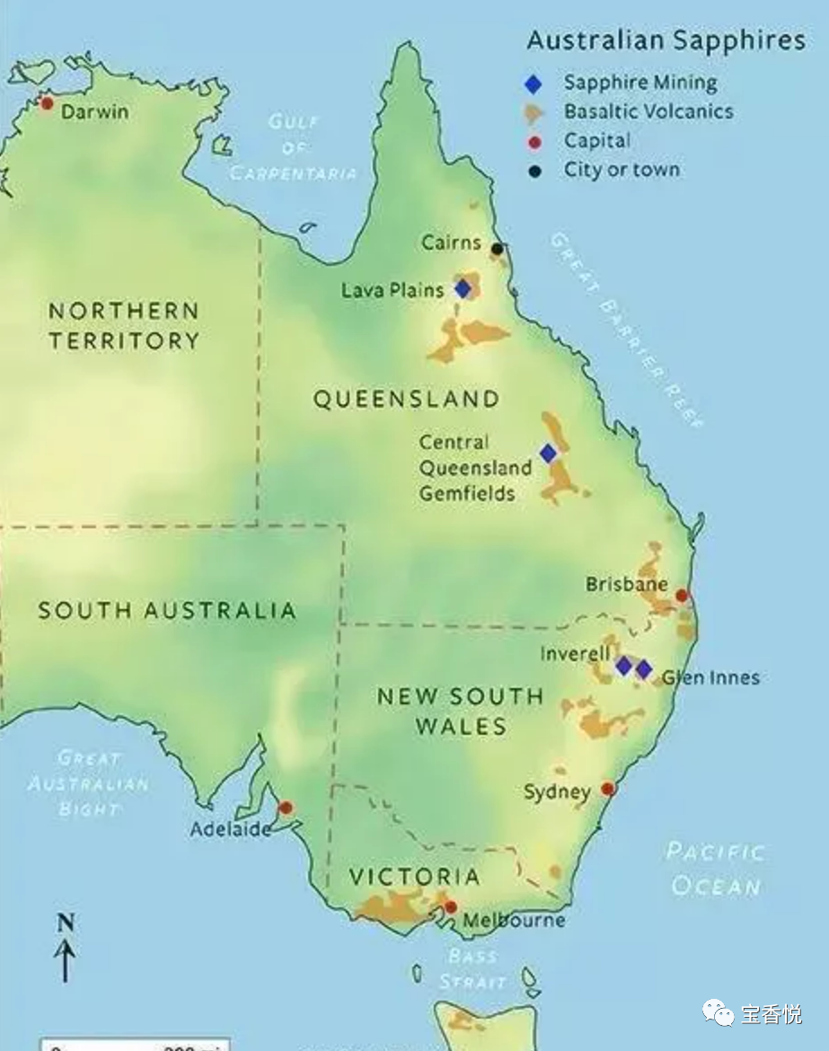 昆士蘭州的安納基及新南威爾士的因弗雷爾-格冷伊尼斯地區(qū)產藍寶石,其產量占世界總產量的60%。