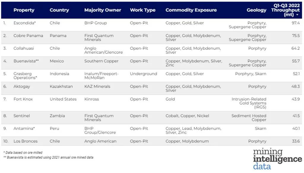 11月25日,礦業(yè)情報 (Mining Intelligence) 根據(jù)2022年1-3季度的礦石開采量(百萬噸)數(shù)據(jù),發(fā)布了最新世界十大礦山排名。值得注意的是,除了印度尼西亞的格拉斯伯格礦山 (Grasberg),也是世界第二大銅礦,在2020年由地表轉(zhuǎn)入地下開采外 其它排名前十的礦山均為露天開采。