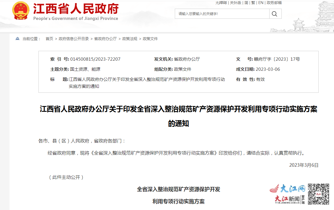 日前,江西省人民政府在其官方網站上發(fā)布了《全省深入整治規(guī)范礦產資源保護開發(fā)利用專項行動實施方案》(下稱《方案》),從礦業(yè)權設置審批、礦山開采監(jiān)管、規(guī)范礦山企業(yè)經營、礦山生態(tài)修復、建設綠色礦山、礦山安全生產和產業(yè)鏈供應鏈安全等方面提出了六大措施,深入整治規(guī)范礦產資源保護開發(fā)利用。