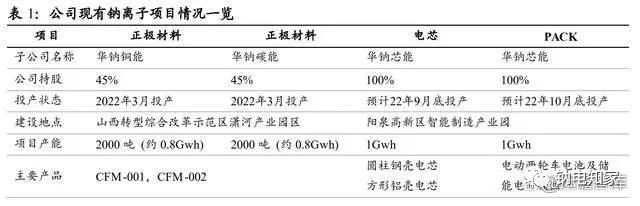 公司早在 2020 年就參與了中科海鈉的 Pre-A 輪融資,并于 21 年進(jìn)一步增資。此后伴隨 21 年 6 月 1Mwh 鈉電儲能系統(tǒng)投運(yùn),公司即開啟了鈉離子正負(fù)極材料示范項目,該項目于 21 年 3 月投產(chǎn)。隨著年內(nèi)電芯廠、PACK 廠的投產(chǎn),預(yù)計將于年底開啟量產(chǎn)項目。