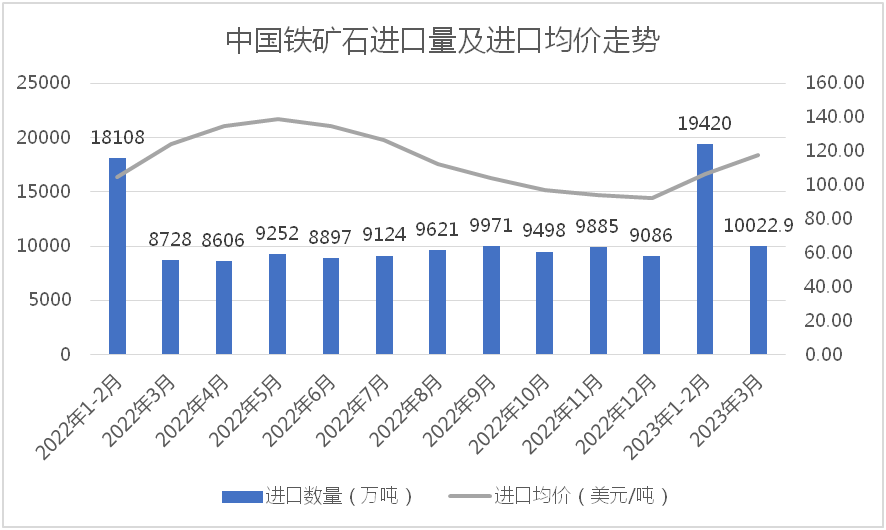 據(jù)海關(guān)總署數(shù)據(jù)顯示,2023年1-3月份,我國累計進口鐵礦石29433.5萬噸,同比增長9.8%,進口均價110.6美元/噸,同比下降12.0%。但值得注意的是,今年3月份,我國進口鐵礦石量價齊升,單月進口鐵礦石達到10022.9萬噸,同比增長14.8%,進口均價為117.7美元/噸,較今年1-2月均價上漲11.43美元/噸,增長10.76%。