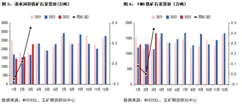 據(jù)mysteel和五礦期貨統(tǒng)計,四大礦山3月份發(fā)貨數(shù)據(jù)同比大幅增加。3月份力拓發(fā)貨量2595.6萬噸,同比增加50%;必和必拓發(fā)貨量2152萬噸,同比增加25%。淡水河谷發(fā)貨量2189.4萬噸,同比增加30%;FMG發(fā)貨量1622.3萬噸,同比增加41%。