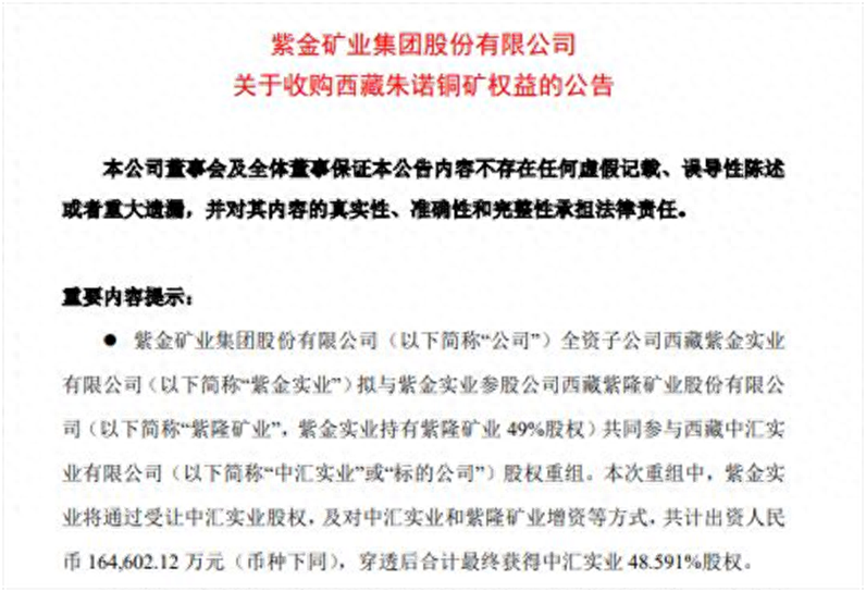 8月21日,紫金礦業(yè)宣布,以16.46億元收購中匯實業(yè)48.591%股權(quán),進而獲得國內(nèi)未開發(fā)超大型銅礦西藏朱諾銅礦的相對控股權(quán)。根據(jù)協(xié)議,未來,朱諾銅礦的建設(shè)及運營將由紫金礦業(yè)主導。