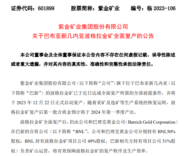 紫金礦業(yè)旗下巴布亞新幾內(nèi)亞波格拉金礦峰回路轉(zhuǎn),迎來復(fù)產(chǎn)倒計時。12月11日,紫金礦業(yè)發(fā)布公告,宣布波格拉金礦已于近日達(dá)成全面復(fù)產(chǎn)所需的全部前提條件,并將于2023年12月22日正式啟動復(fù)產(chǎn),預(yù)計將于2024年第一季度產(chǎn)出第一批合質(zhì)金。