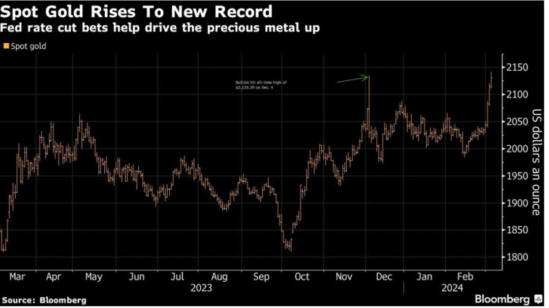 自2月28日至今,國際金價連續(xù)上漲。3月5日,現(xiàn)貨黃金價格創(chuàng)歷史新高,一度達(dá)到2141美元/盎司,打破了去年12月4日創(chuàng)下的每盎司2135.39美元的紀(jì)錄。國際金價在過去五個交易日上漲超過100美元。而據(jù)媒體從多個黃金珠寶品牌獲悉,其3月5日公布的國內(nèi)足金首飾價格均突破645元/克,在前一日歷史高位的基礎(chǔ)上,再創(chuàng)新高。