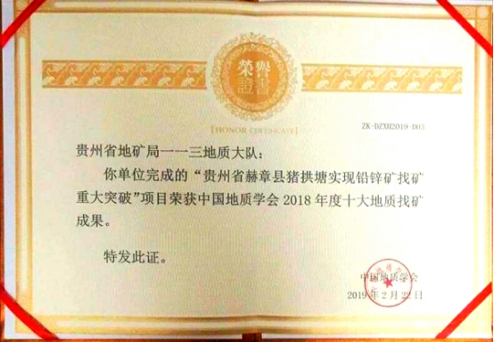 豬拱塘鉛鋅礦是地質(zhì)找礦新機制“商業(yè)跟進”的又一成功范例,其重大找礦成果被業(yè)界高度認可,先后榮獲中國地質(zhì)學會頒發(fā)“2018年度十大地質(zhì)找礦成果獎”、第七屆“中國有色金屬地質(zhì)找礦成果獎”一等獎。