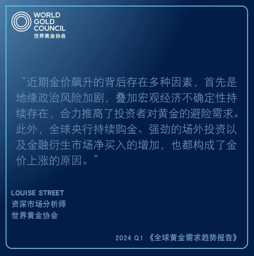 世界黃金協(xié)會資深市場分析師路易斯·斯特里特(Louise Street)分析稱:“近期金價飆升的背后存在多種因素,首先是地緣政治風(fēng)險加劇,疊加宏觀經(jīng)濟不確定性持續(xù)存在,合力推高了投資者對黃金的避險需求。此外,全球央行持續(xù)購金、強勁的場外投資及金融衍生市場凈買入的增加,也都構(gòu)成了金價上漲的原因。東西方投資者的行為趨勢正在發(fā)生轉(zhuǎn)變。