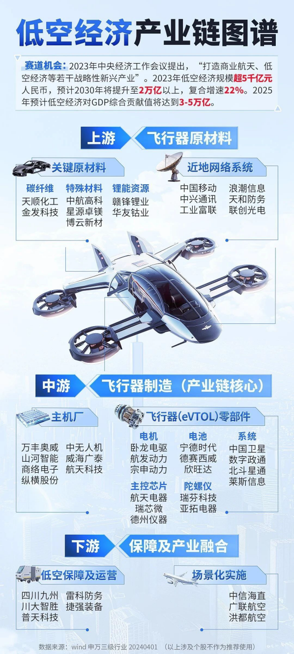 從2019年起,低空空域逐步放開,國家政策持續(xù)扶持低空經(jīng)濟(jì)的發(fā)展。今年3月份,“低空經(jīng)濟(jì)”首次寫入《政府工作報(bào)告》。同樣是在3月,工業(yè)和信息化部、科學(xué)技術(shù)部、財(cái)政部、中國民用航空局聯(lián)合印發(fā)《通用航空裝備創(chuàng)新應(yīng)用實(shí)施方案(2024—2030年)》,提出到2030年,推動低空經(jīng)濟(jì)形成萬億級市場規(guī)模。