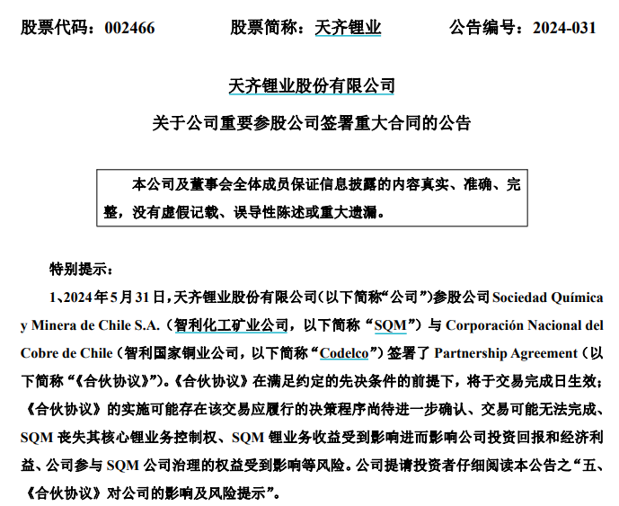無獨有偶。前段時間,另一礦企天齊鋰業(yè)也遭遇了相似的海外資產(chǎn)權(quán)屬的問題。作為SQM(智利化工礦業(yè)公司)的第二大股東,天齊鋰業(yè)在不知情的情況下,SQM與Codelco將組建由政府控制的合營公司,共同開發(fā)鋰礦資源。