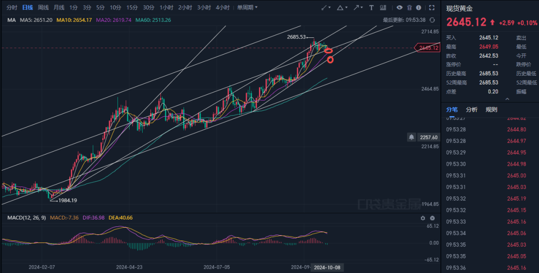 行情回顧:近期就業(yè)數(shù)據(jù)靚麗,投資者降低了對美聯(lián)儲11月大幅降息的預(yù)期,美元保持強勢,美債收益率時隔兩個月首次升破4%,令金價承壓?,F(xiàn)貨黃金延續(xù)回調(diào),錄得日線四連陰,盤中最低觸及2637.71美元/盎司,最終收跌0.40%,報2642.63美元/盎司,市場對美聯(lián)儲降息幅度的預(yù)期減少。