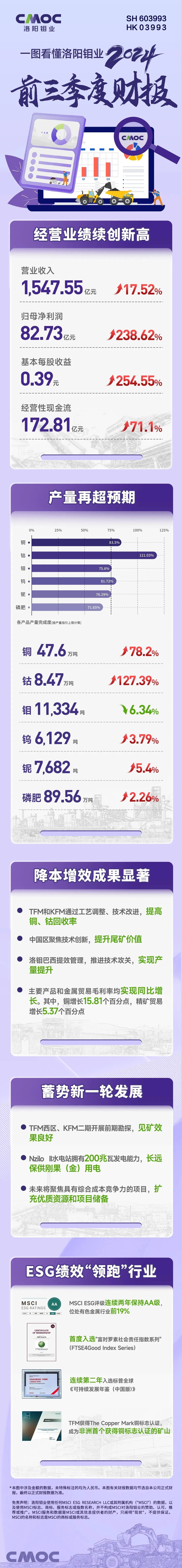 10月28日,洛陽鉬業(yè)公布的最新財報顯示:今年前三季度,公司實現(xiàn)營業(yè)收入1547.55億元,同比增長17.52%;歸屬于上市公司股東的凈利潤超越2023年全年業(yè)績,達到82.73億元,同比增長238.62%;基本每股收益0.39元,同比增長254.55%。