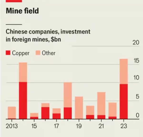 在具體礦產(chǎn)投資上,中國公司也非常具有戰(zhàn)略性。《經(jīng)濟(jì)學(xué)人》稱,隨著中國在電池、電動(dòng)汽車和太陽能電池板等產(chǎn)品上越來越具有競(jìng)爭(zhēng)力,中國對(duì)海外礦業(yè)的投資也越來越多。銅礦是電氣化的重要材料,去年中國企業(yè)對(duì)這種這礦產(chǎn)的投資約占其海外礦產(chǎn)投資的3/5。