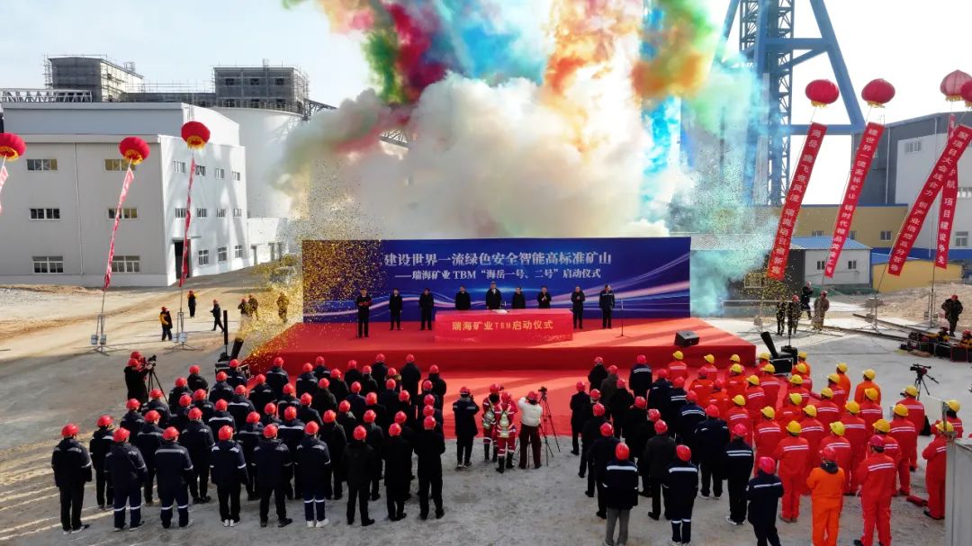2024年12月30日上午9時(shí)36分,瑞海礦業(yè)有限公司副井井塔前嘉賓齊聚、彩球飄飄、旌旗獵獵,十二條巨幅標(biāo)語(yǔ)迎風(fēng)招展,兩臺(tái)TBM(全斷面硬巖隧道掘進(jìn)機(jī))啟動(dòng)儀式揭幕,瑞海礦業(yè)總經(jīng)理于明海、浙江省隧道工程集團(tuán)公司副董事長(zhǎng)黃德祥、山東招金礦業(yè)股份有限公司董事長(zhǎng)姜桂鵬先后作了發(fā)言和致辭。上午10時(shí),隨著萊州市政府副市長(zhǎng)邱召明宣布“萊州市瑞海礦業(yè)有限公司‘海岳一號(hào)、海岳二號(hào)’TBM發(fā)車”,萊州市政府副市長(zhǎng)邱召明,招遠(yuǎn)市政府副市長(zhǎng)荊興業(yè),山東招金集團(tuán)有限公司副董事長(zhǎng)、總經(jīng)理王樂譯,招金礦業(yè)董事長(zhǎng)姜桂鵬等嘉賓共同按下啟動(dòng)球。