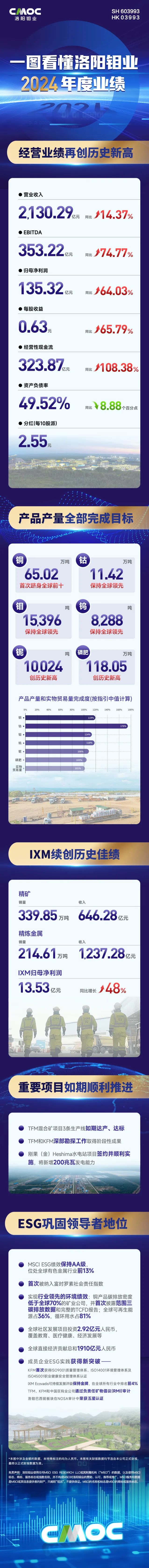 3月21日,洛陽(yáng)鉬業(yè)發(fā)布的業(yè)績(jī)報(bào)告顯示,公司2024年?duì)I業(yè)收入首次邁入兩千億元門(mén)檻,為2130.29億元,同比增長(zhǎng)14.37%;歸母凈利潤(rùn)首破百億元,為135.32億元,同比增長(zhǎng)64.03%;扣非后歸母凈利潤(rùn)131.19億元,同比增長(zhǎng)110.48%;每股收益0.63元,同比增長(zhǎng)65.79%。