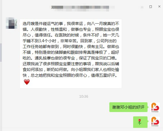 向姐非常的貼心周到,我和寶寶都很依賴她~她技術專業(yè),而且總是滿臉笑容,給我很大的鼓勵~現(xiàn)在她下戶了,我們家里都非常舍不得她。謝謝向姐,希望向姐以后一切順利一直幸福。也謝謝你們公司其他工作人員,祝你們公司越來越好。